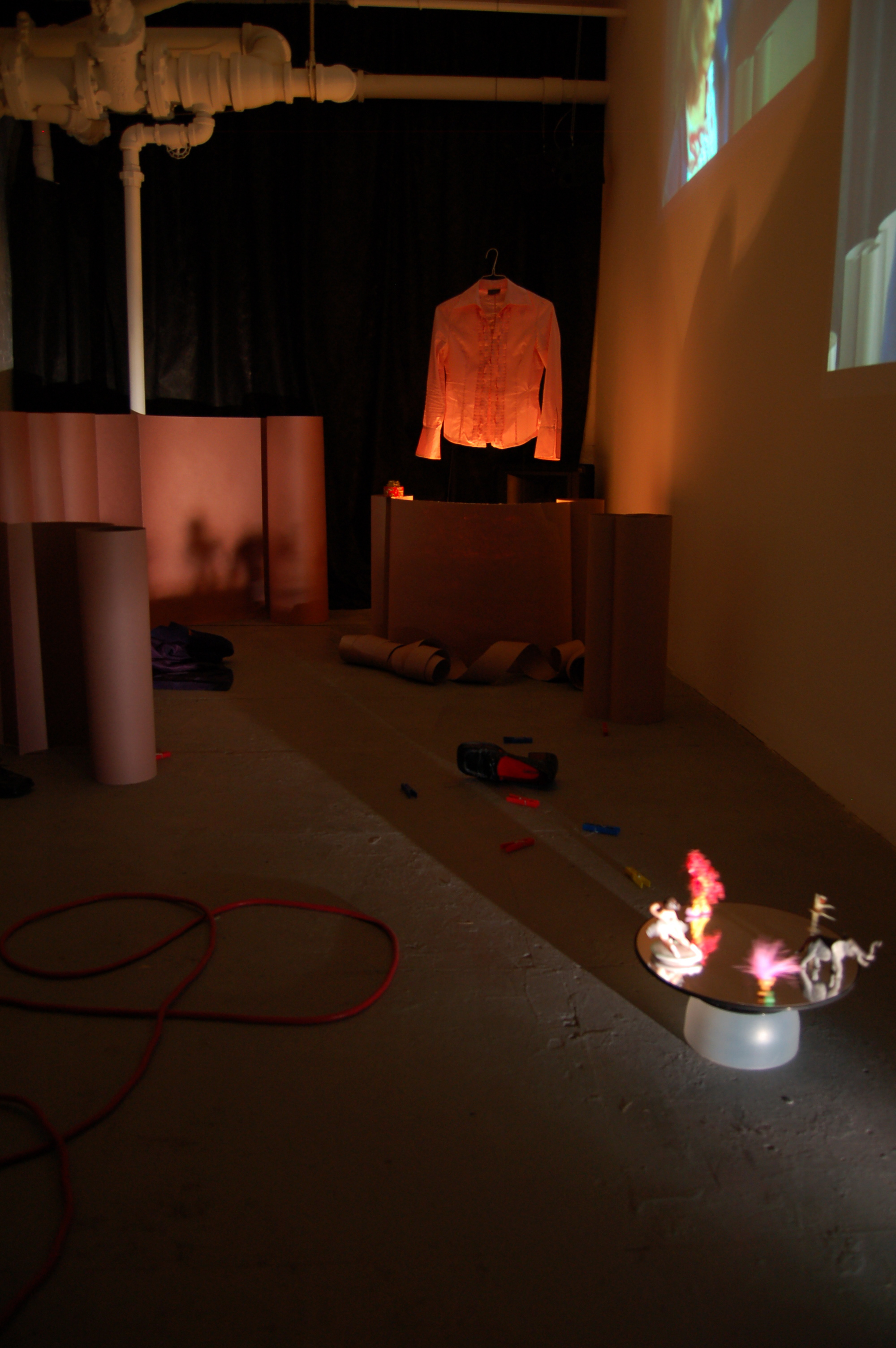 This collaboration with choreographer and dancer Linda Austin used the camera to extract and reconfigure a solo from her larger project Circus Me Around. By filming three different renditions of the dance from three different heights (at foot, torso and head level), the body was fragmented into separate parts and projected throughout the space. The solo becomes “a round” as the three performances (with their rustling, footfalls and bits of speech and song) move in and out of sync. Props, set elements and lights created a tableau in the space, suggesting and reflecting various moments from the dance.