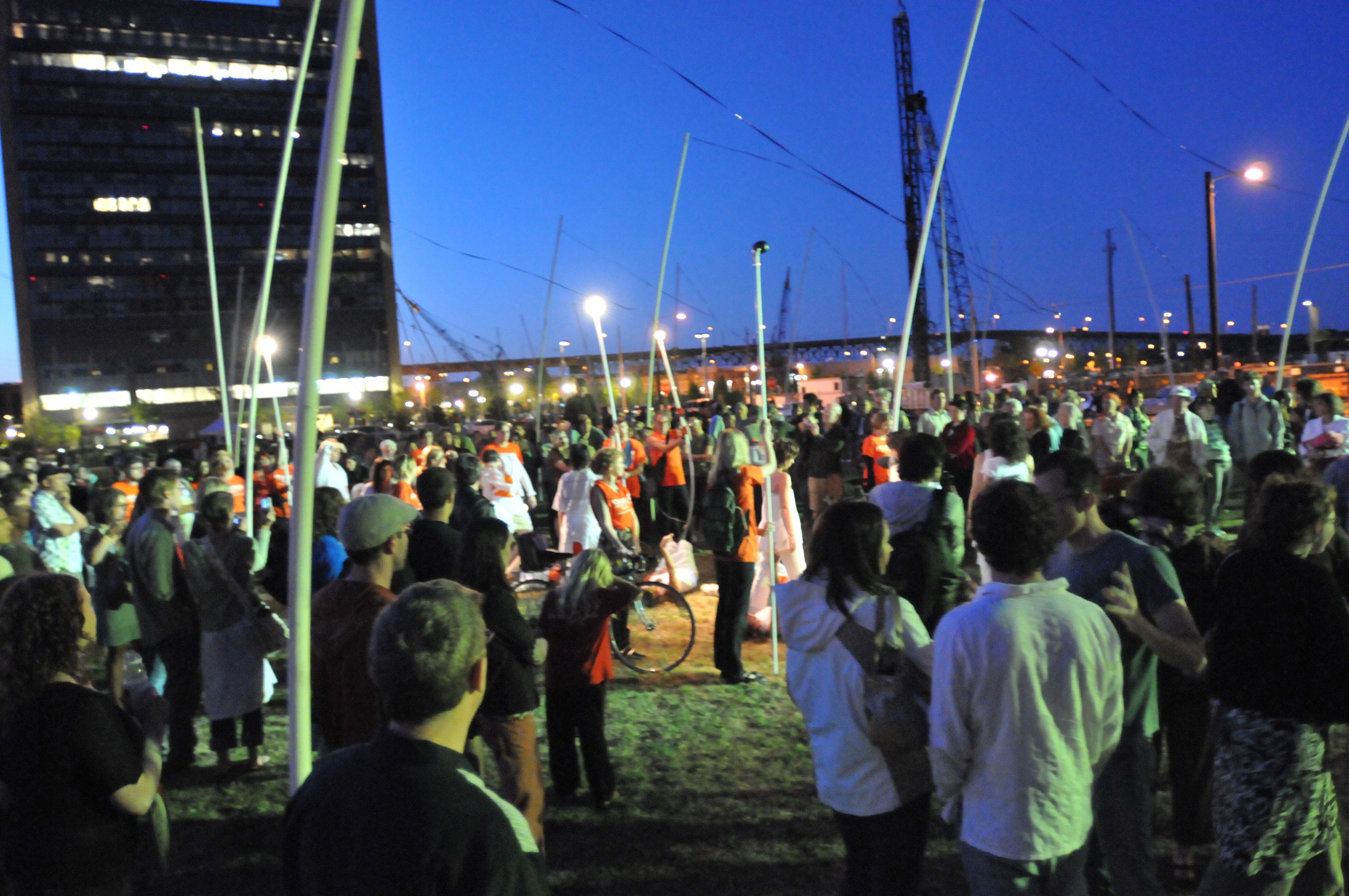 This outdoor dance performance was the culmination of Linda K Johnson’s year-long artist residency amid the construction of the South Waterfront. Promenade responded to a rectangular park – a blank plot of grass surrounded by cranes and just-finished high-rise buildings. A PA system was mounted on the balcony of a nearby condo, where I mixed ambient tones at a volume just loud enough to integrate with the urban environment. Six performer-participants rode bicycles with portable amps attached. Circling the park, they played long drones to create a swirling doppler effect. The bicyclists then moved among the audience, playing clusters, streams and bursts of loosely synchronized sound. At various locations, dancers dressed entirely in white performed short interactions, illuminated by a crew holding battery-powered lights on long poles.