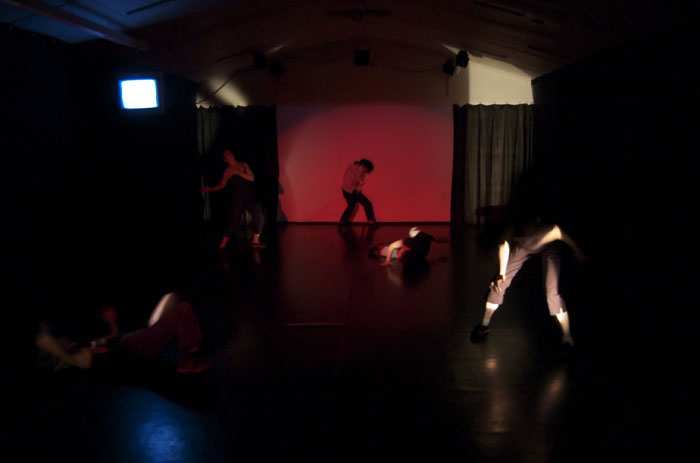 Choreography, including long “non-sequitur” movement sequences, interspersed with moments of dialogue, abstracted violence and shards of action. Along both sides of the stage, dancers silently mimicked and responded to movements behind semi-transparent black curtains. Mounted on the ceiling, a television monitor played a continuous hour-long action by Kaj-Anne Pepper (coming slowly unraveled in an all white “weatherbox”). An ambiguous narrative included slow-motion mock battles, chanted syllables and swung lightbulbs.